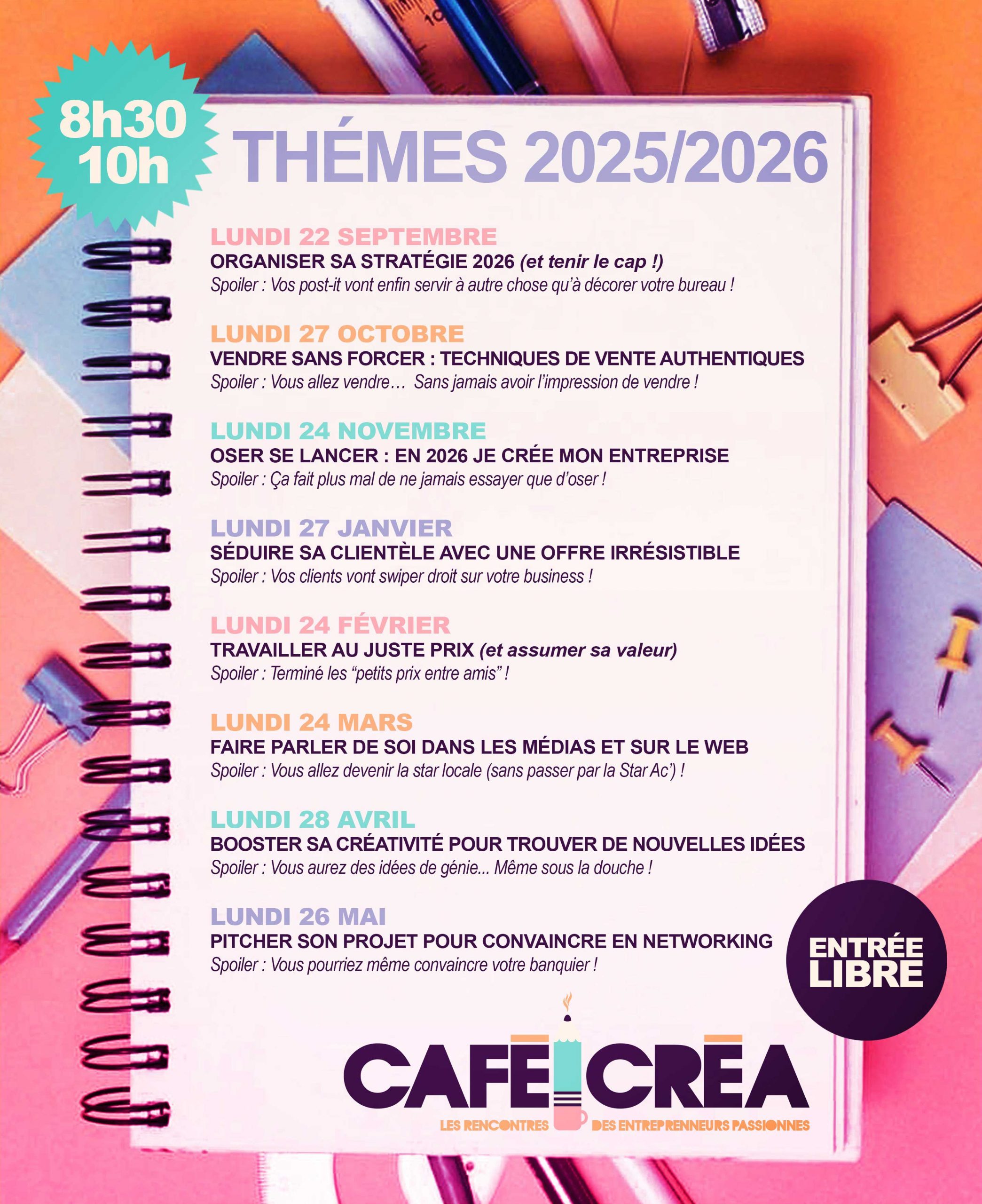 Les Cafés Créa’ sont faits pour vous : un moment convivial pour échanger avec d’autres entrepreneurs, poser vos questions, trouver des réponses concrètes et repartir avec des idées pratiques pour avancer.